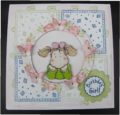 This is my entry or the Magnolia make your own background which i made two of ,the actual background paper and the 4 patch work squares which were needed for the Passion for promarkers challenge .I made background with a heart and flower motif then i made my four square patch work pieces then using my big shot and spellbinders to cut a circle within a circle .I stamped leaves and flower around the thinner circle using martha stewart small floral set .Then i stamped butterflys fom same set and using inks i colured the top and bottom of the butterflys with two shades of martha stewert inks .Stuck them on ,stamped birthday girl punched a larger disc .